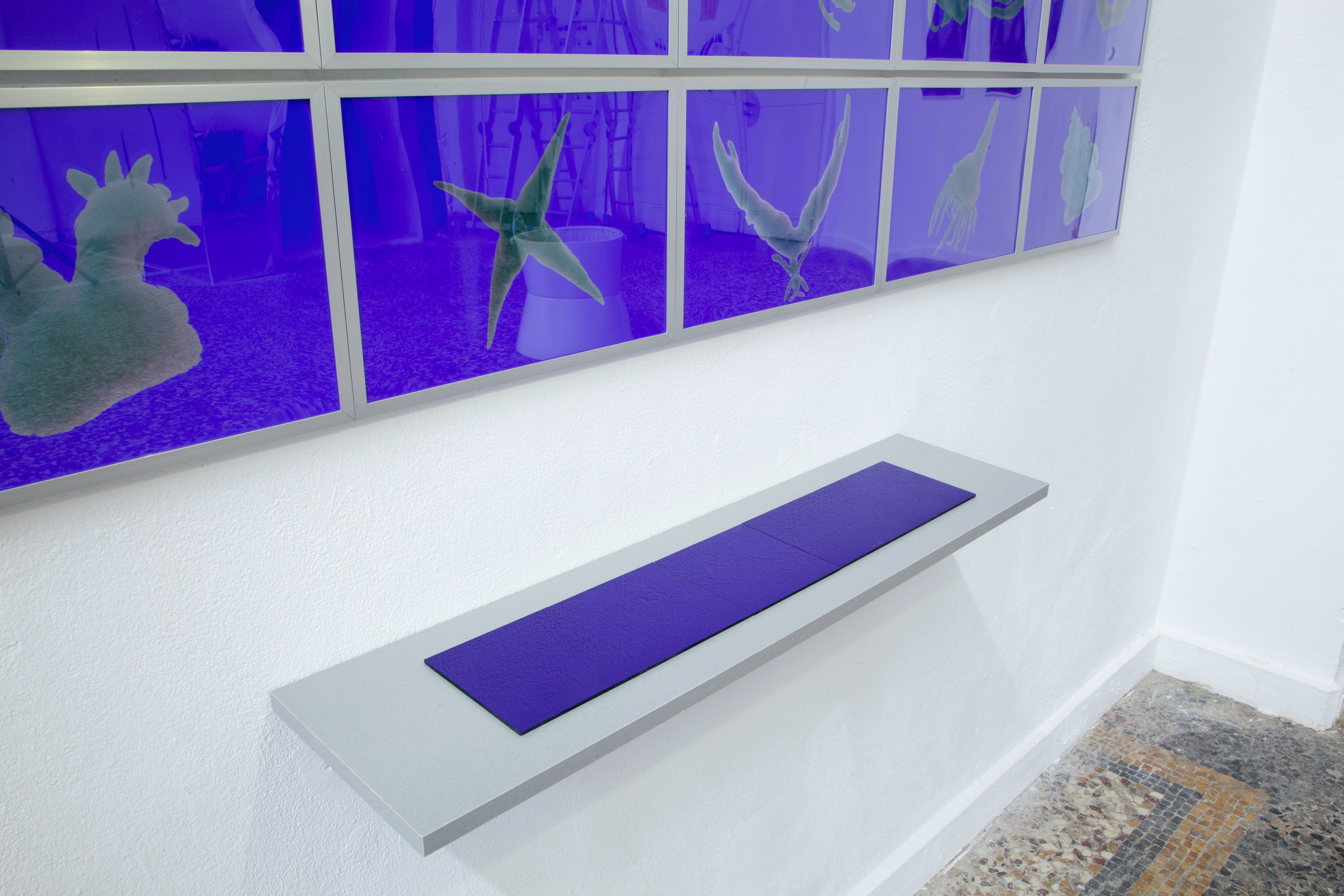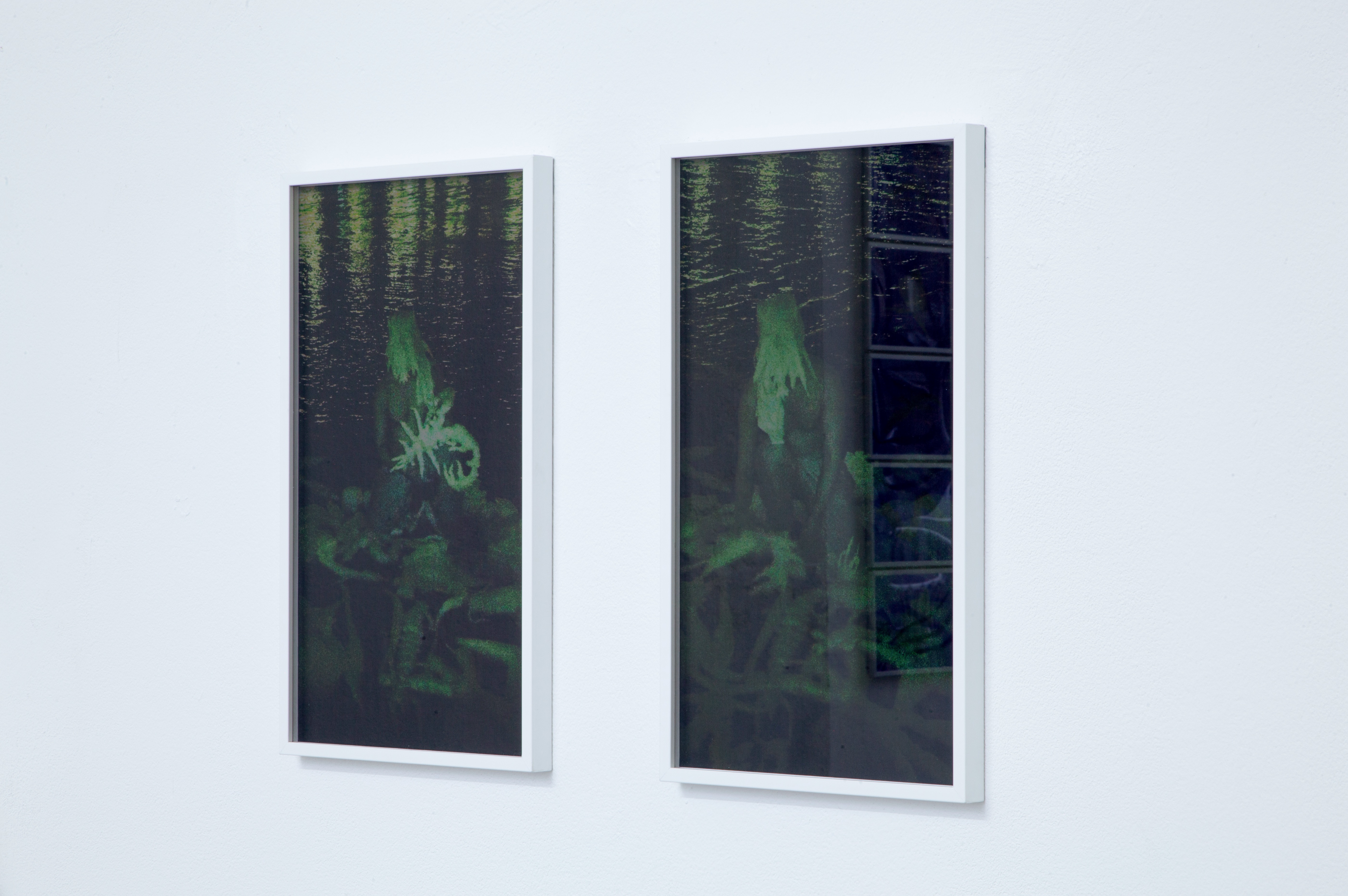 Eines Nachts, wie an vielen anderen Tagen auch, dachte ich über Eoreum어름 nach und ging mit einem Freund im Rhein schwimmen. Berührbare Dinge schienen mir zu sagen, dass ich hier war. Ich stellte mir vor, dass der ganze Körper durch die Empfindung erwachen könnte, im kalten Wasser, in der Dunkelheit, wenn nichts wirklich zu sehen ist. Ich kann nicht gut schwimmen. Irgendwann geriet ich in Panik. Ich schluckte viel Wasser, ruderte, und schaffte es kaum zurück an eine Stelle, an der ich wieder stehen konnte. Als ich wieder zu mir kam, trieben Tiere um mich herum. Es waren keine Tiere vertrauter Art. Mein Freund und ich zogen die seltsam aussehenden Tiere an Land. Während wir sie herausholten, wurden sie immer kleiner. Mein Freund fotografierte sie, aber ich wollte richtige Bilder dieser Tiere behalten, während sie kleiner wurden, also brachte ich sie ins Atelier. Auch dort wurden sie weiter kleiner, bis ich sie zum Fotografieren auf eine Platte von Handflächengröße legen musste. Einige waren schon verschwunden, während ich die anderen fotografierte. Ich stellte die Fotografien von jenem Tag zusammen mit den Platten aus, auf denen diese Tiere gelegen hatten. Vielleicht sind sie gar nicht verschwunden, sondern nur so klein geworden, dass man sie nicht mehr sehen kann, und sind noch immer dort, auf diesen Platten. Vielleicht werden sie noch immer kleiner.
