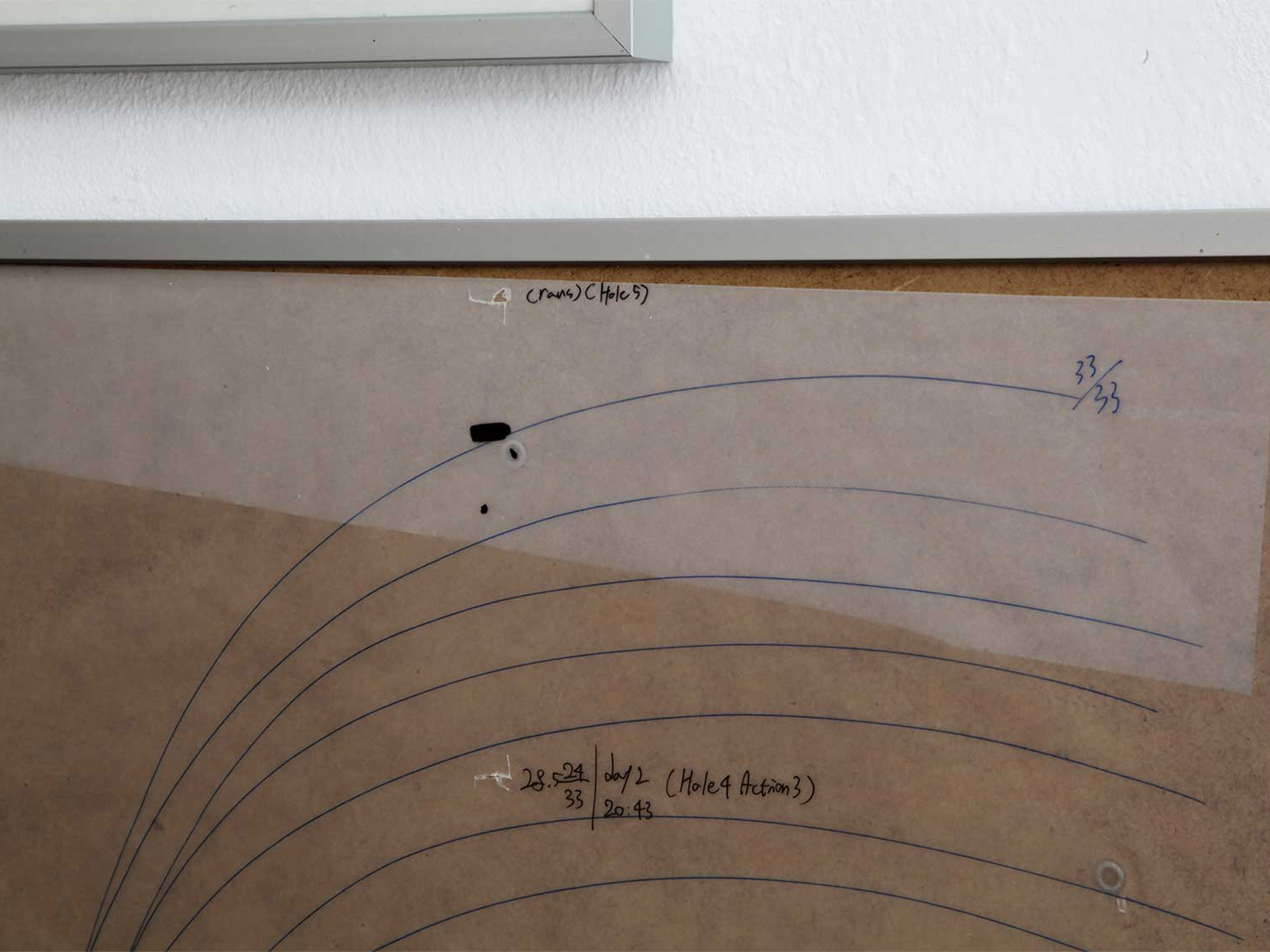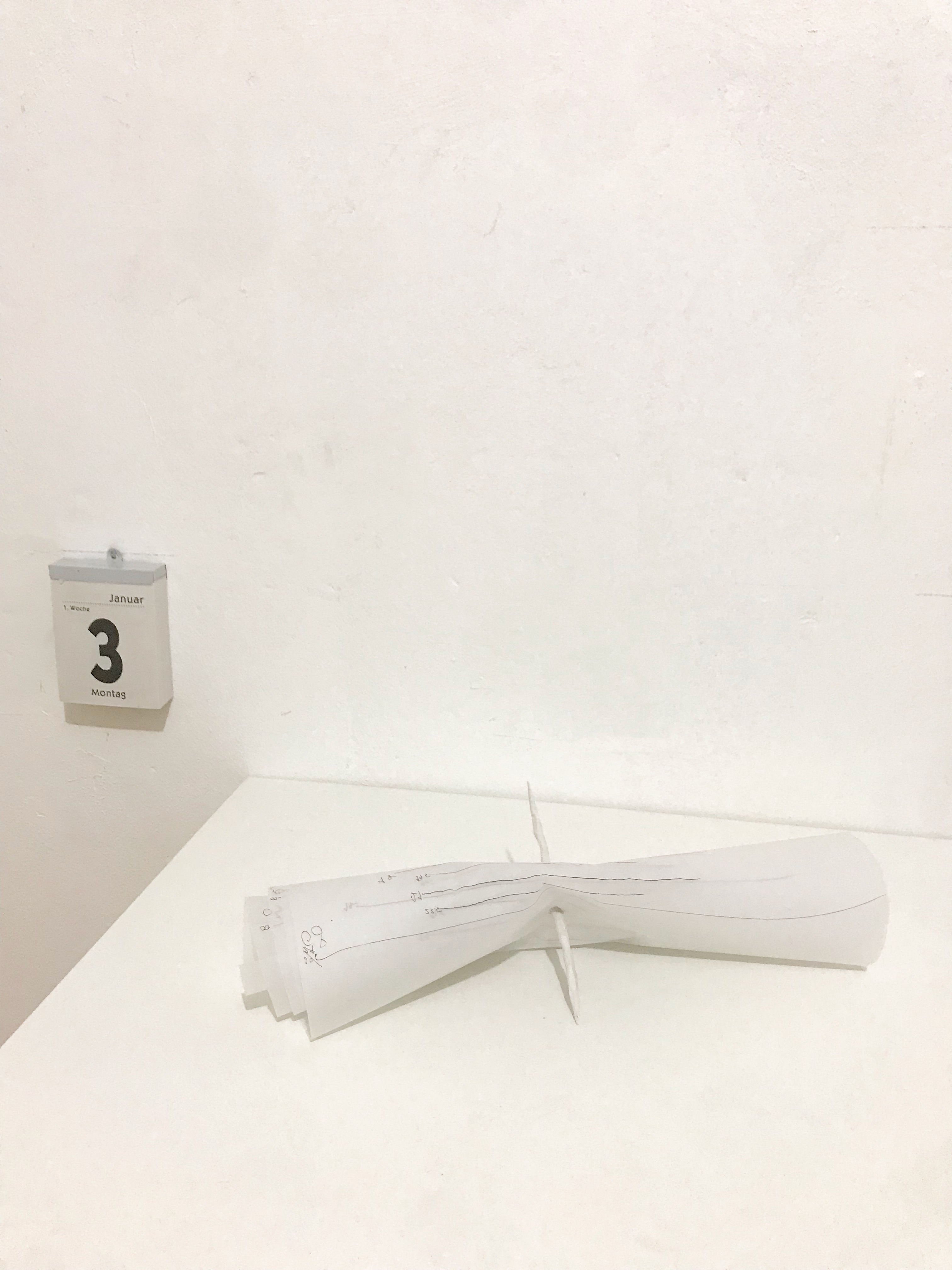 On a sheet of translucent paper I had drawn dozens of lines so that they looked like an S-shape. I did not call it a drawing, Drawing, but anyway when I counted them there were 73 lines in total. 33 on the top, 40 on the bottom. I decided that the lower 40 would be the first day, and the upper 33 the second day. If the 40 lines of the first day are divided across 24 hours, then the first line would be 00:00, the second line would be around 1:40, and so on. So the lines could be read like a kind of calendar. Then I rolled up the paper and pushed through it the spear I had carved. With the feeling of bending spacetime and then piercing through it.
