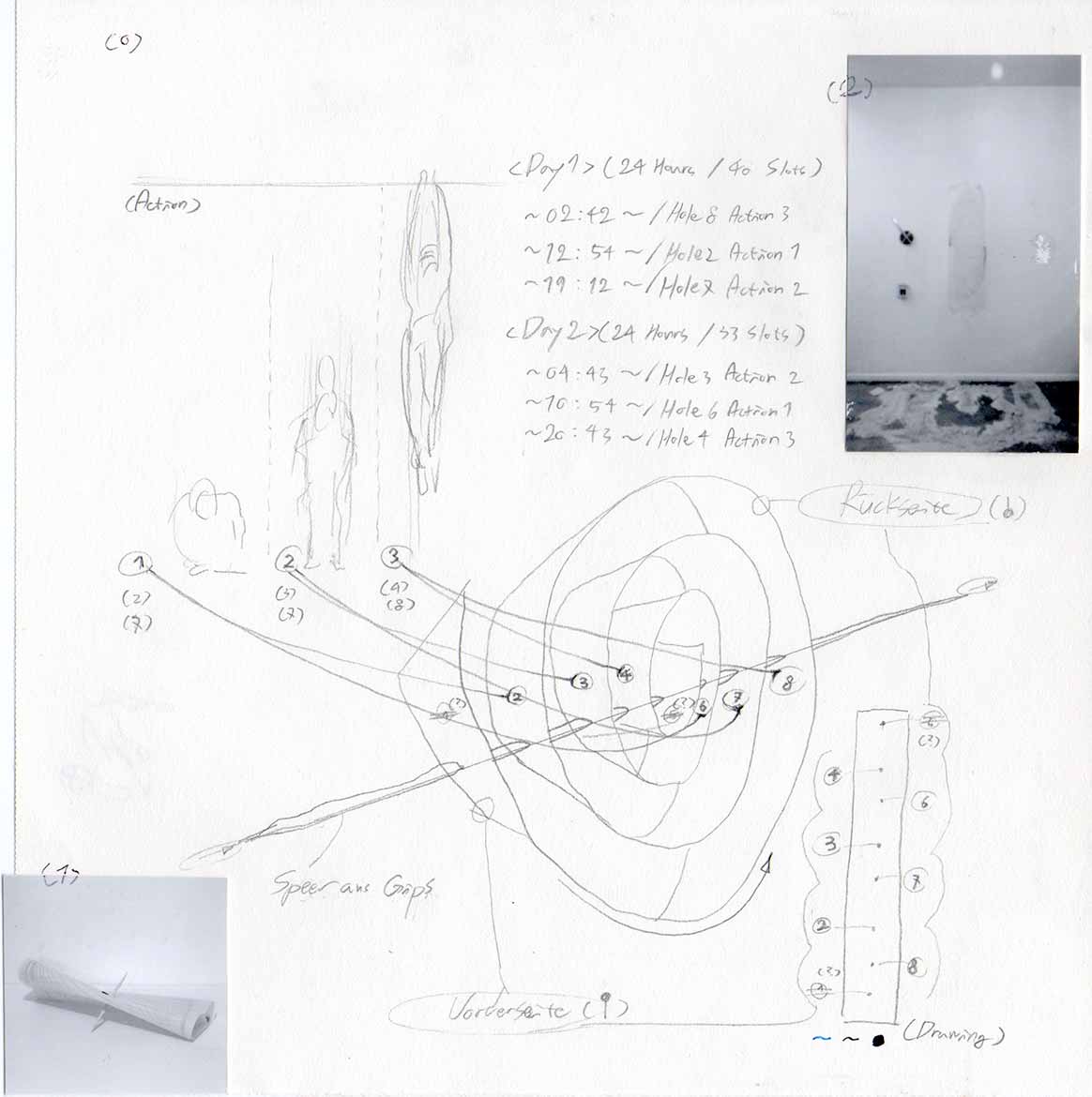 Auf dem entfalteten Papier sind Löcher an den Stellen, an denen der Speer hindurchging. Sechs davon sind sozusagen neben bestimmten Uhrzeiten auf dem Kalender entstanden. Zu jeder dieser Zeiten ging ich ins Atelier, zog mich aus und sprang vor der Kamera. Warum ich mich ausgezogen habe, weiß ich nicht. Ich glaube, ich hielt so etwas damals für künstlerisch. Jedenfalls sprang ich, als würde ich einen Speer werfen. Insgesamt sechs Mal. Sehr früh im Morgengrauen, am Morgen, am späten Nachmittag, nahe Mitternacht, dann wieder am Morgen und am Abend. Als ich diese sechs Fotografien in Photoshop zusammensetzte, erschien eine Form, die, wenn auch etwas dick, einem Speer ähnelte. Die Sprünge fanden zu verschiedenen Zeiten statt, aber als sie sich zu einer einzigen Gestalt überlagerten, sah es wie ein Speer aus. So, als wären die flachen Löcher auf dem Papier in Wahrheit die Form des Speers gewesen.