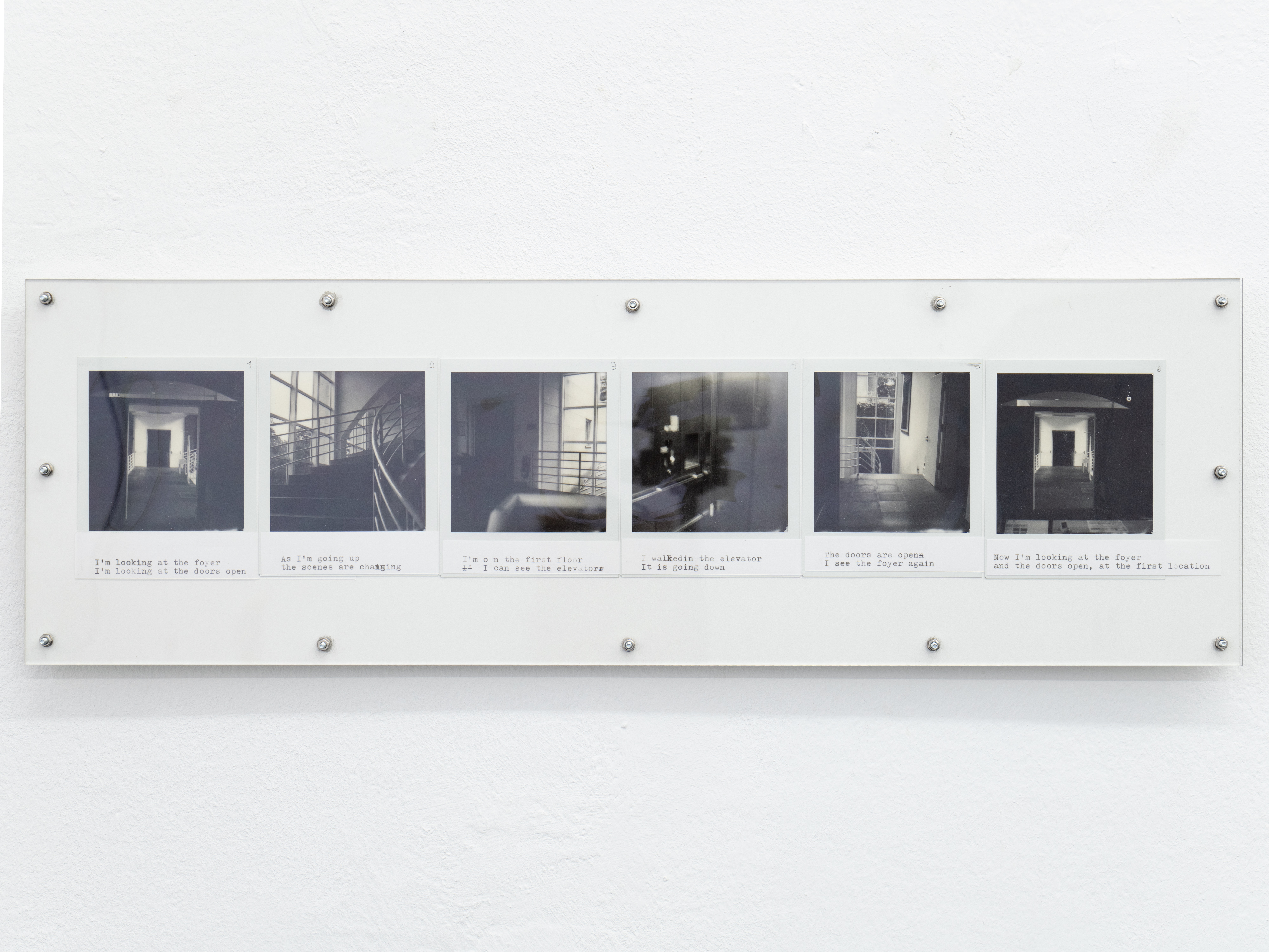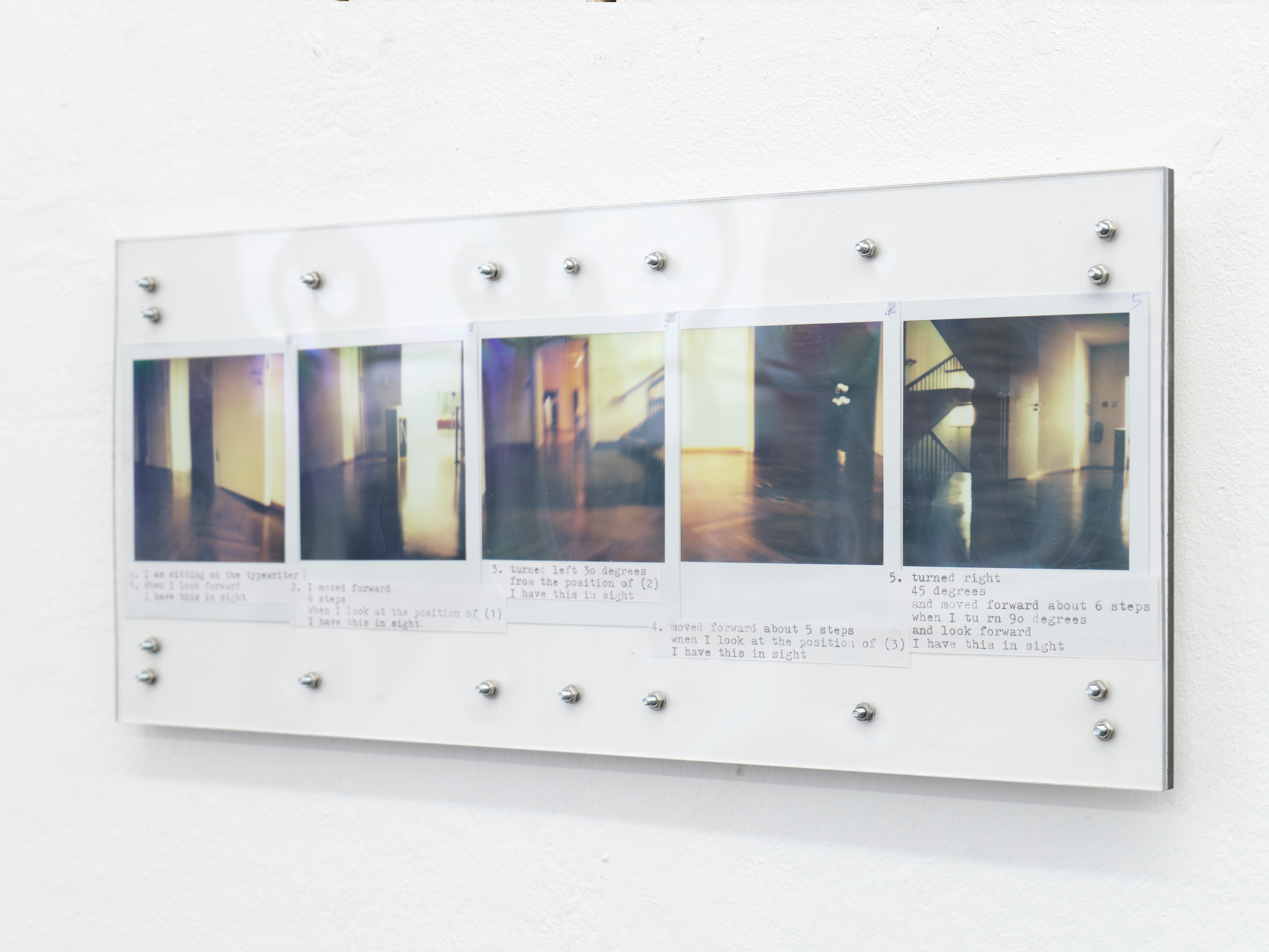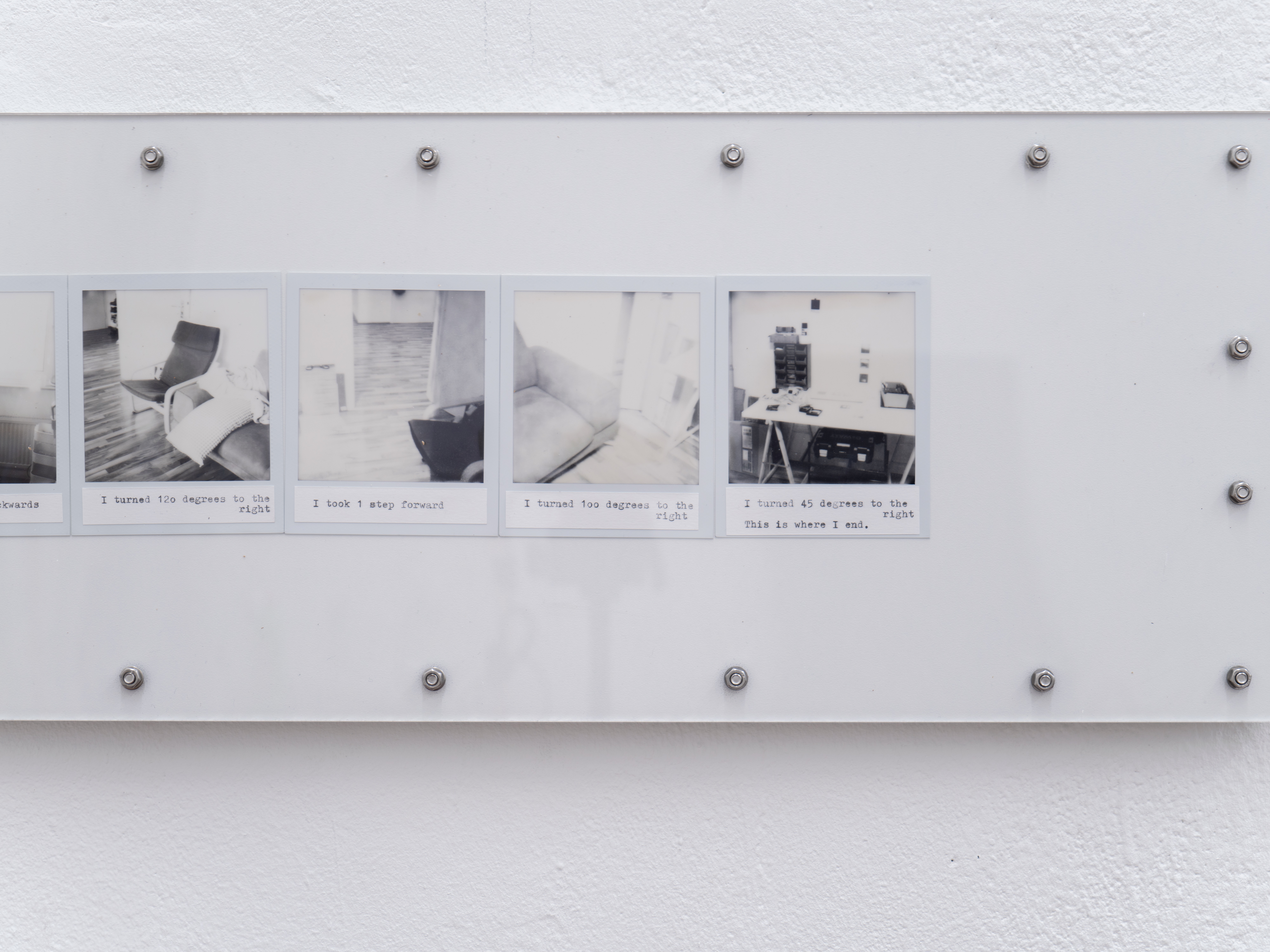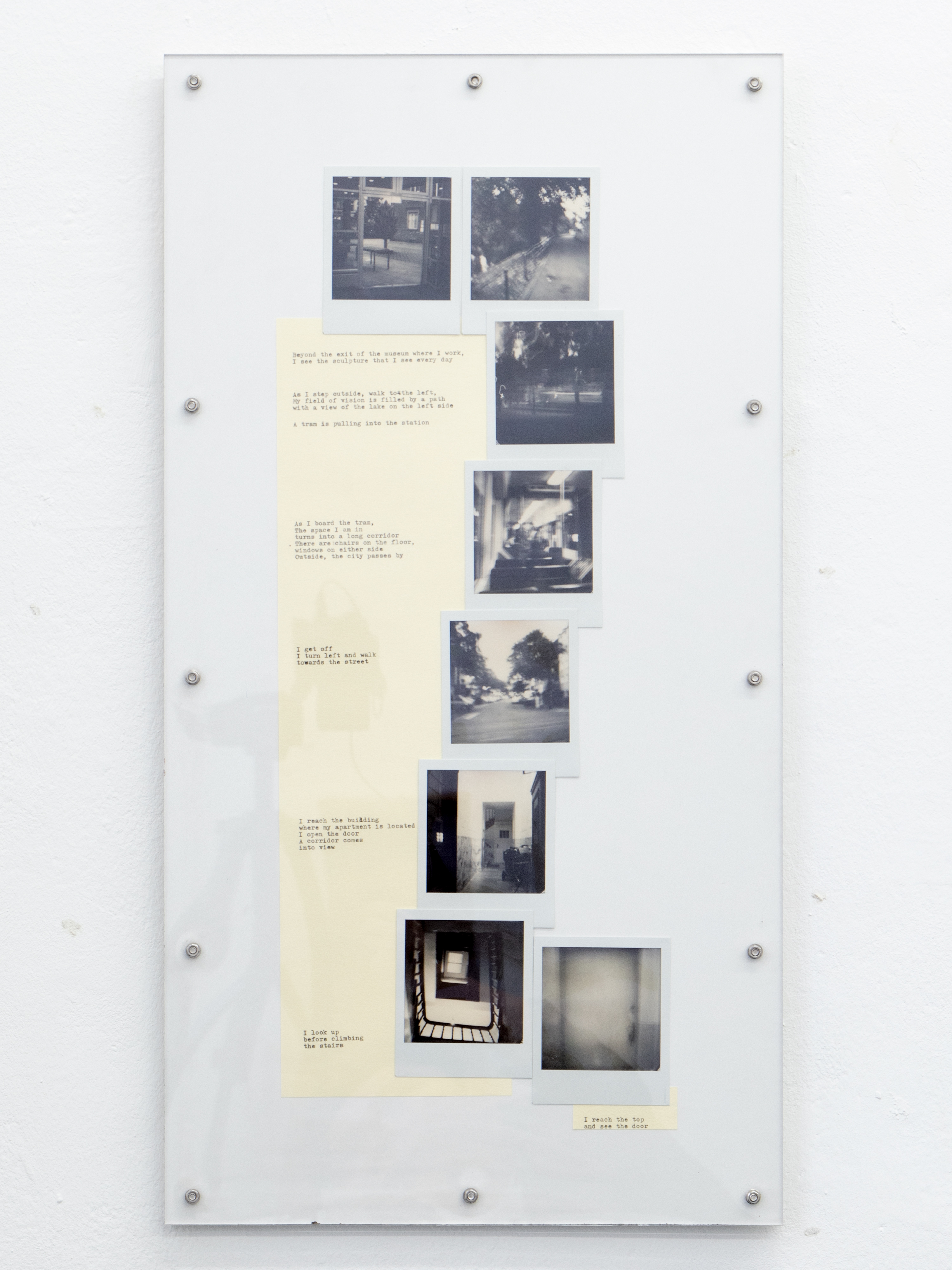 Ausführen bedeutet hier, die Kette oberflächlicher Veränderungen zu beobachten, die sich entfalten, während ich mich durch den Raum bewege: Objekte, die in mein Blickfeld eintreten und es wieder verlassen, die sich nähern oder entfernen, die sich ausdehnen oder zusammenziehen. Indem ich die Beziehung zwischen meinem Blick und meinem Körper verfolge, während ich diesen Objekten begegne, fotografiere ich; ich schreibe. Die so entstandenen Sofortfotos und Texte werden gemeinsam auf einer Platte fixiert und schließen jede Ausführung zu einem in sich vollständigen Abschnitt.