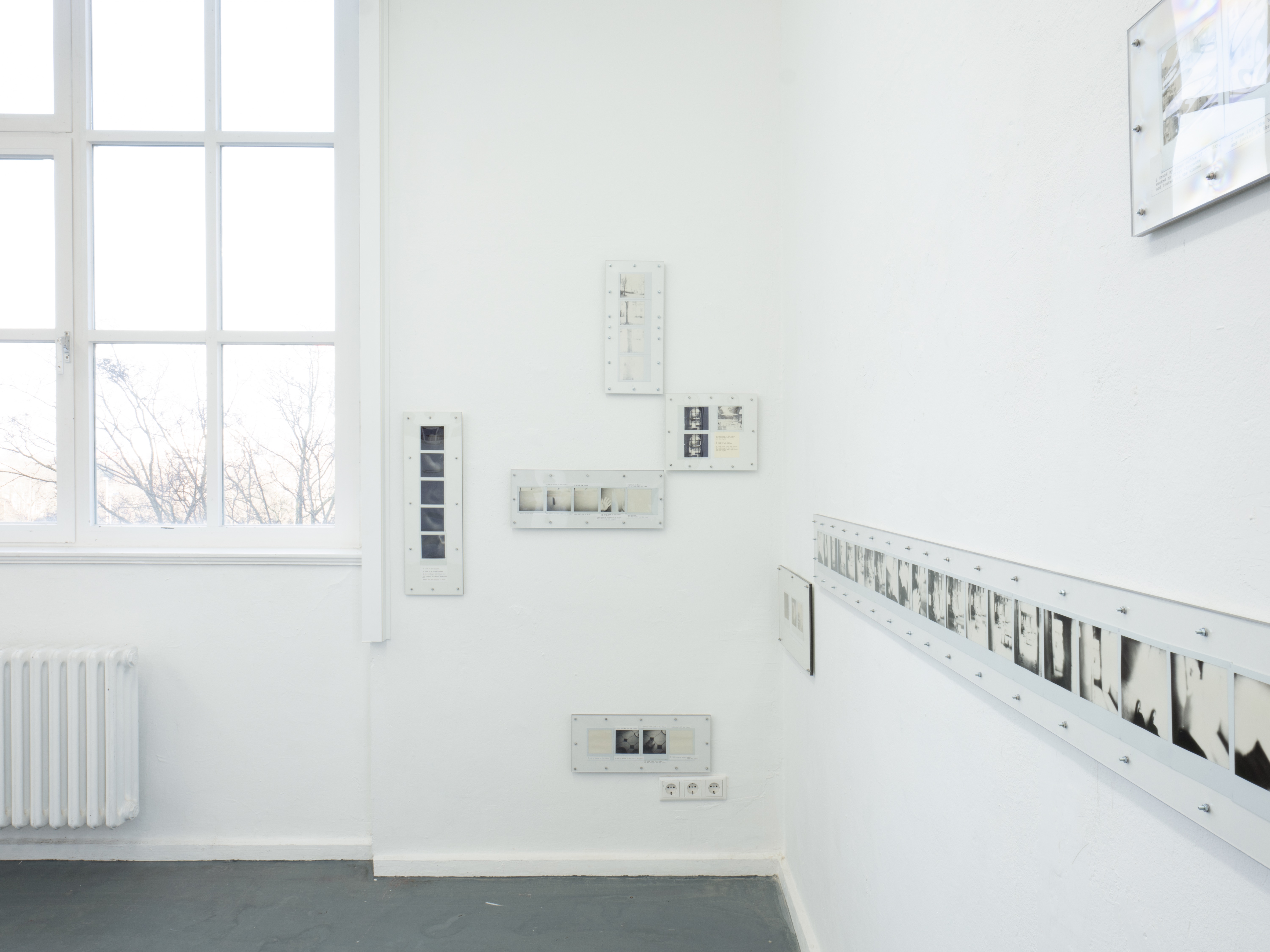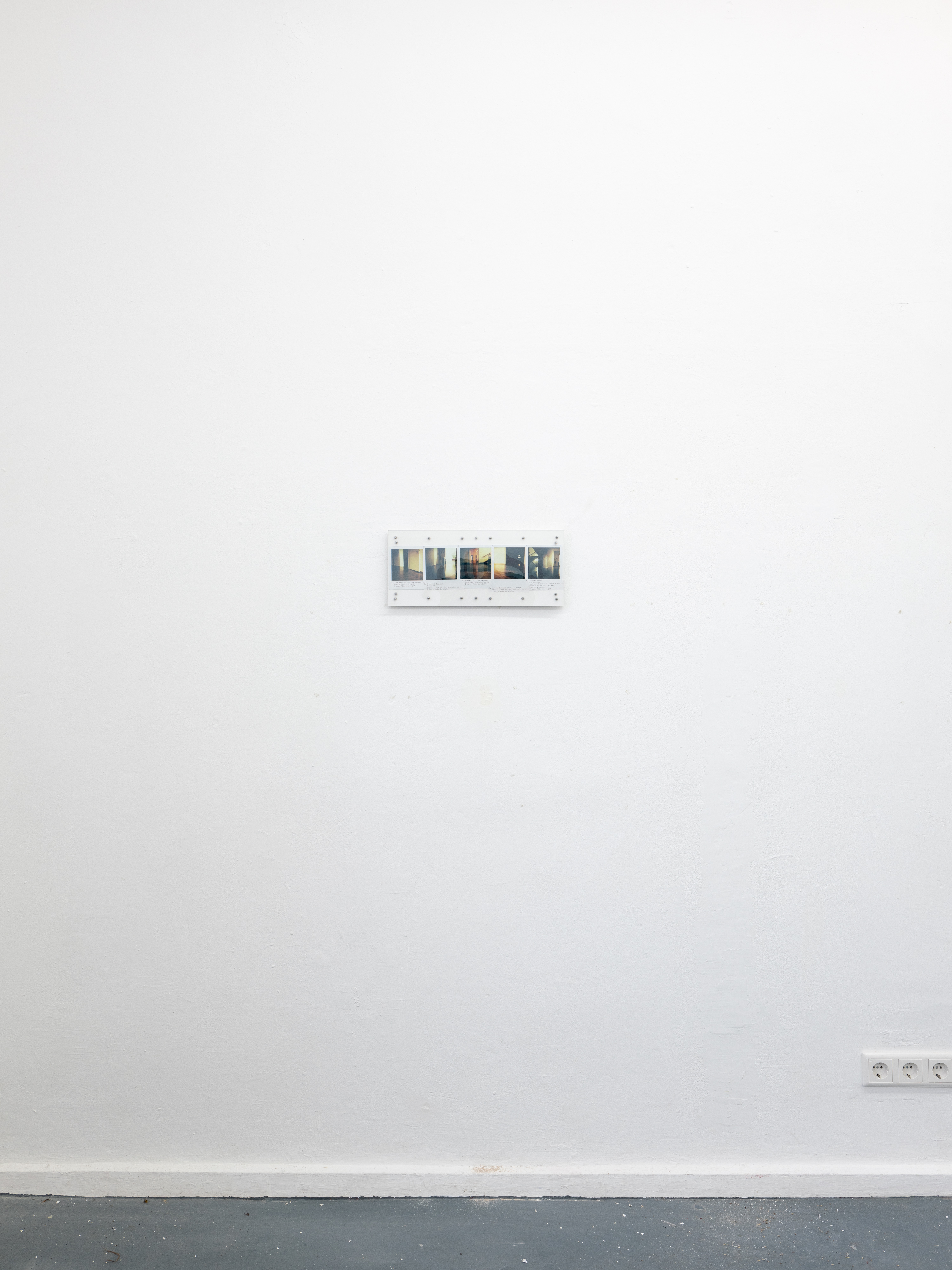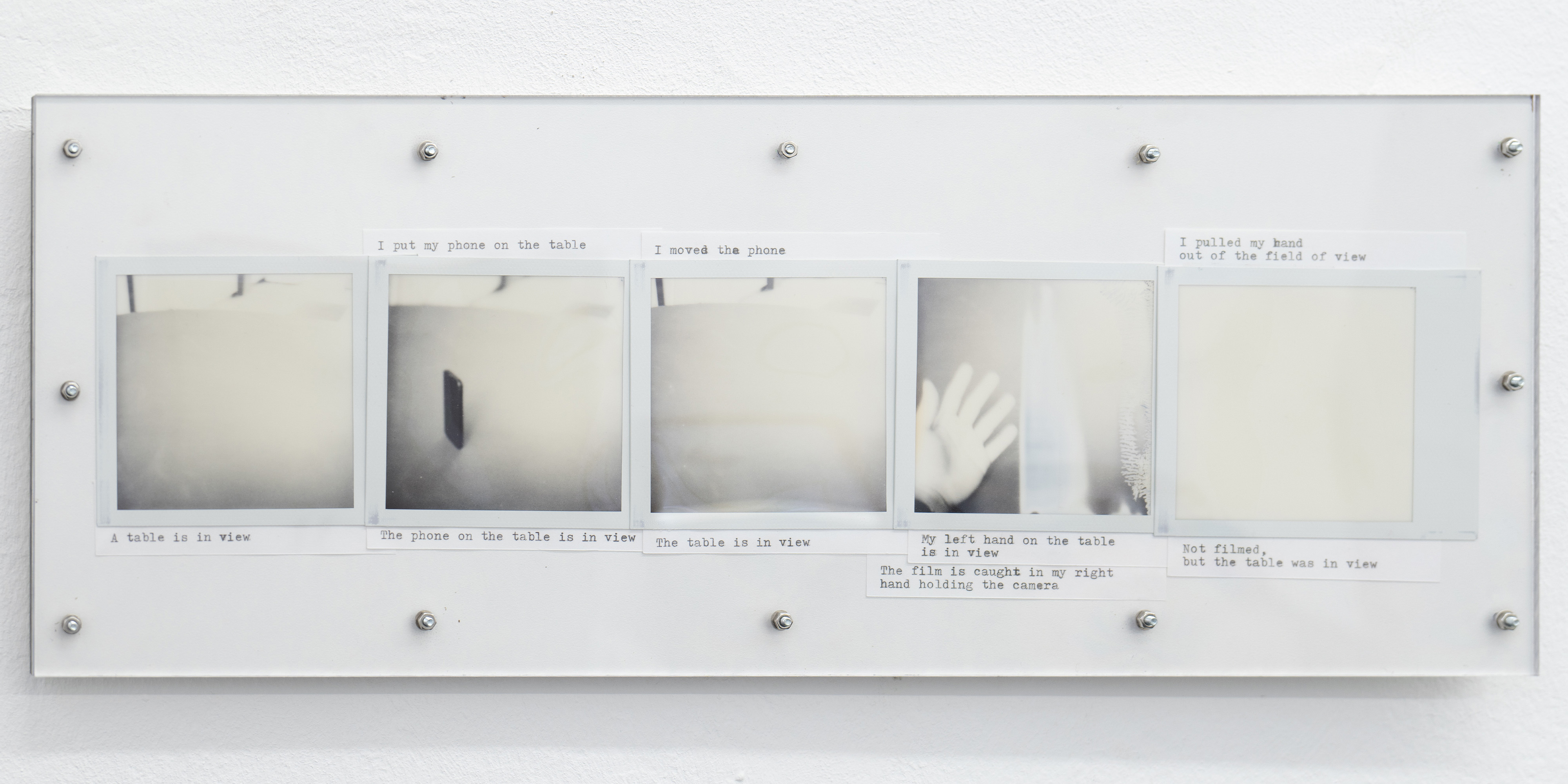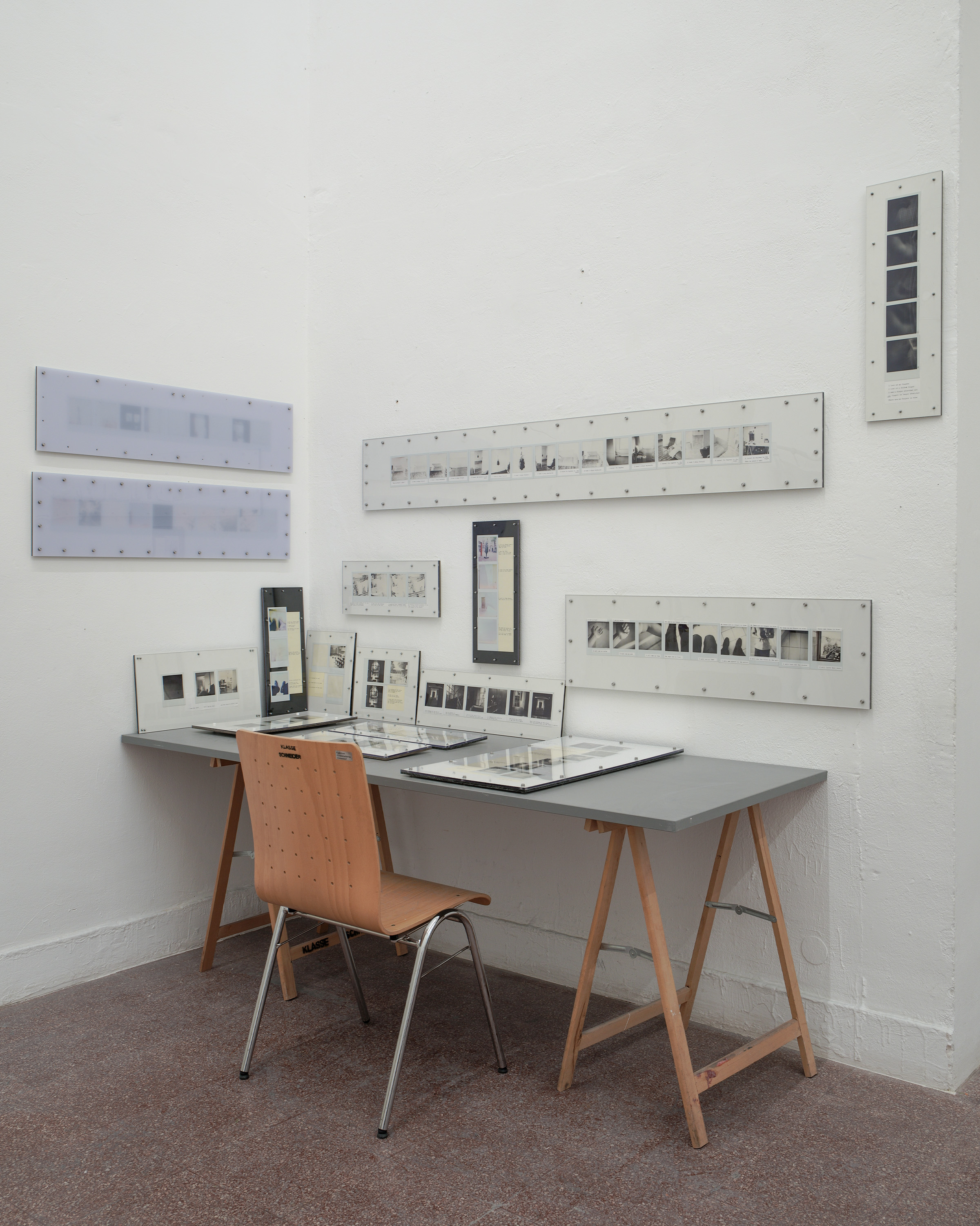 Ausführen bedeutet hier, die Kette oberflächlicher Veränderungen zu beobachten, die sich entfalten, während ich mich durch den Raum bewege: Objekte, die in mein Blickfeld eintreten und es wieder verlassen, die sich nähern oder entfernen, die sich ausdehnen oder zusammenziehen. Indem ich die Beziehung zwischen meinem Blick und meinem Körper verfolge, während ich diesen Objekten begegne, fotografiere ich; ich schreibe. Die so entstandenen Sofortfotos und Texte werden gemeinsam auf einer Platte fixiert und schließen jede Ausführung zu einem in sich vollständigen Abschnitt.