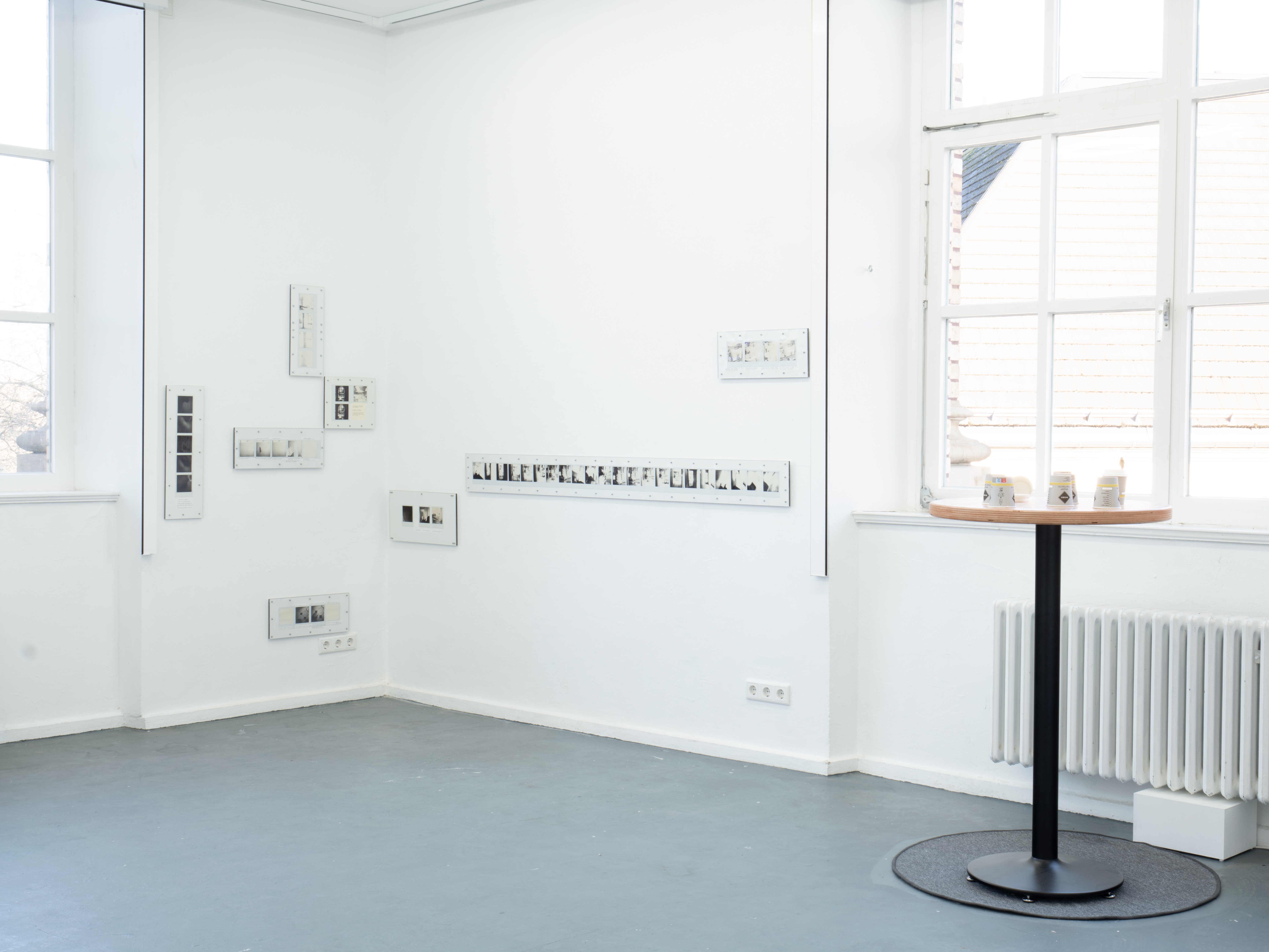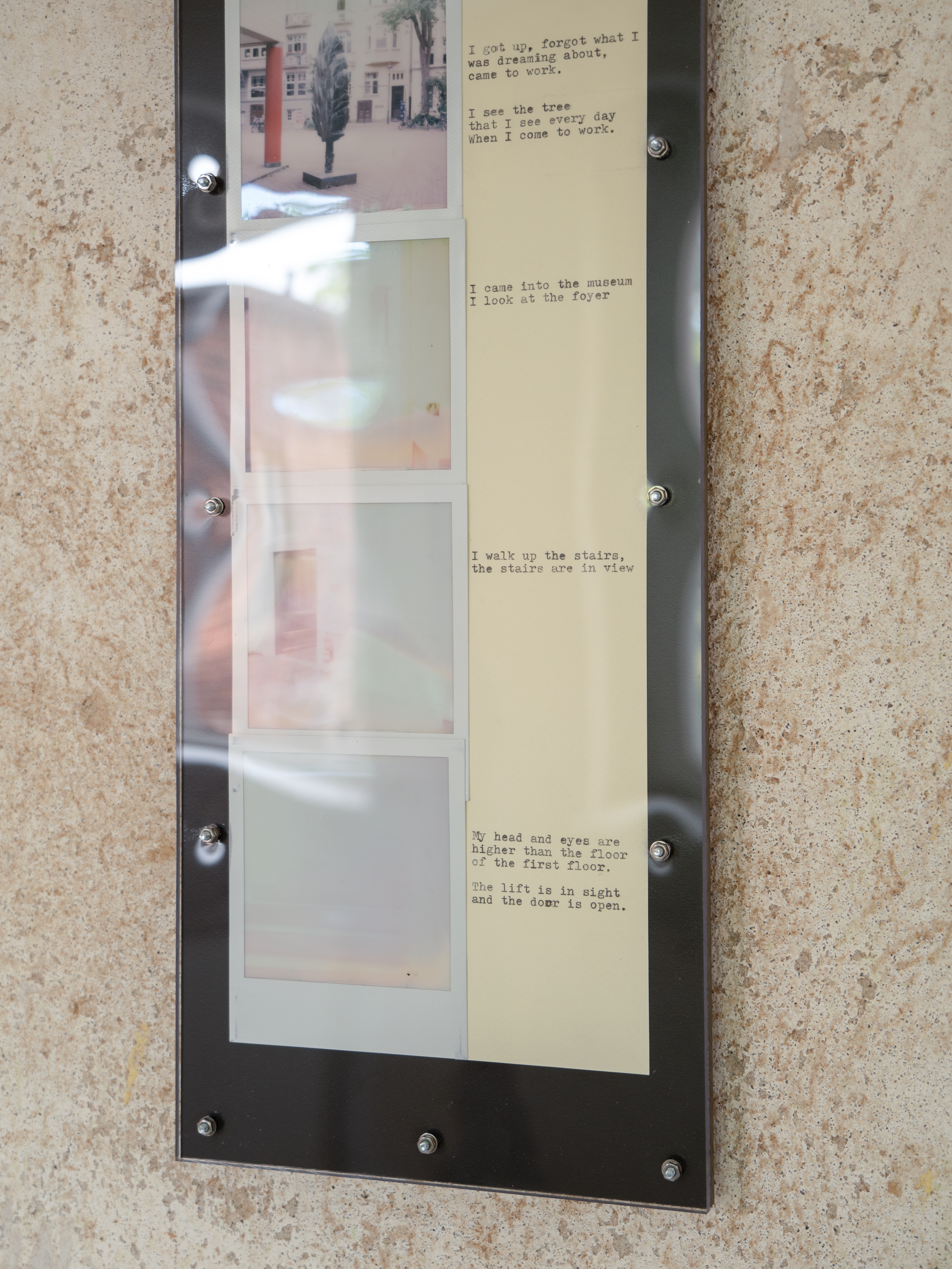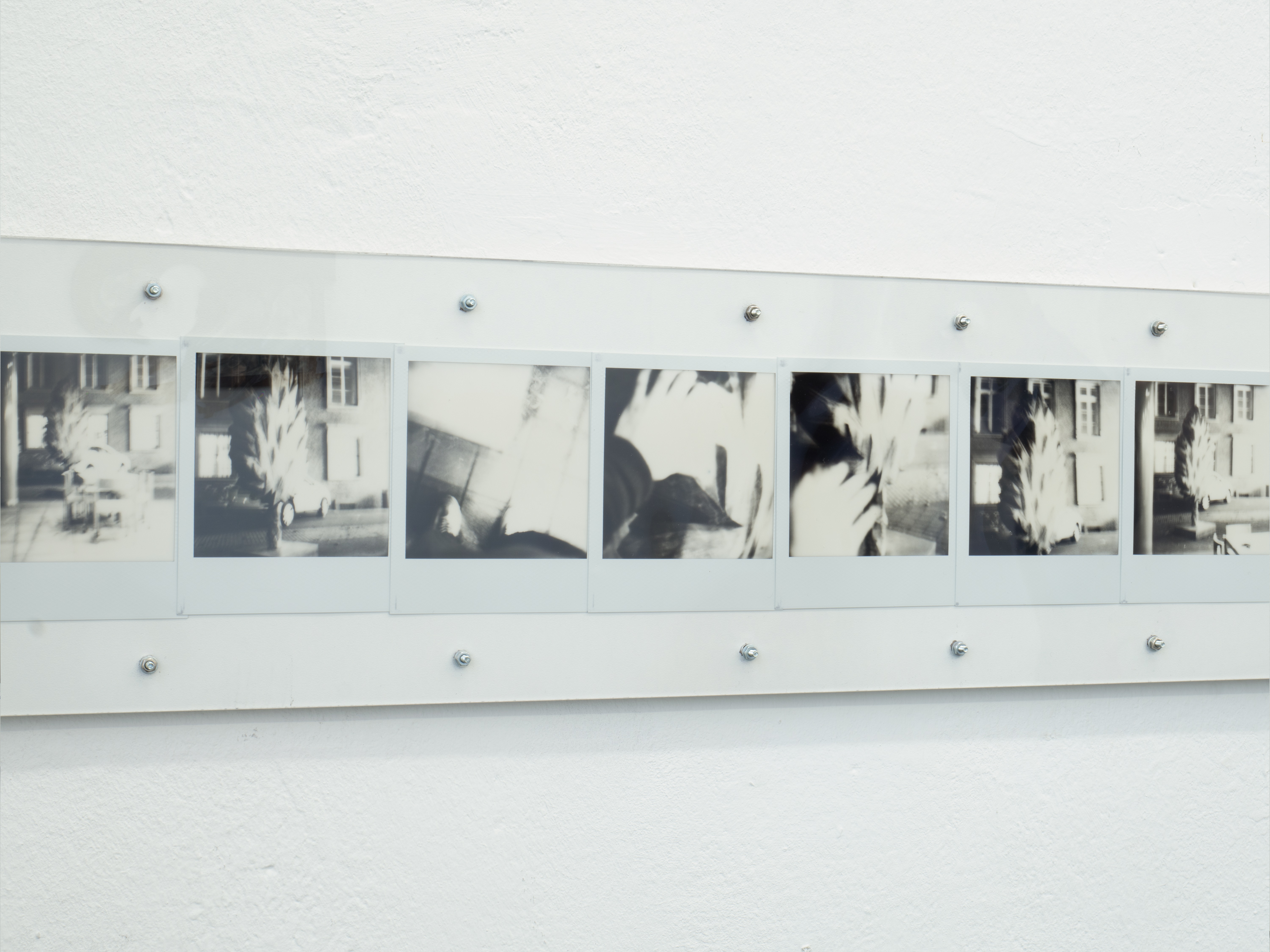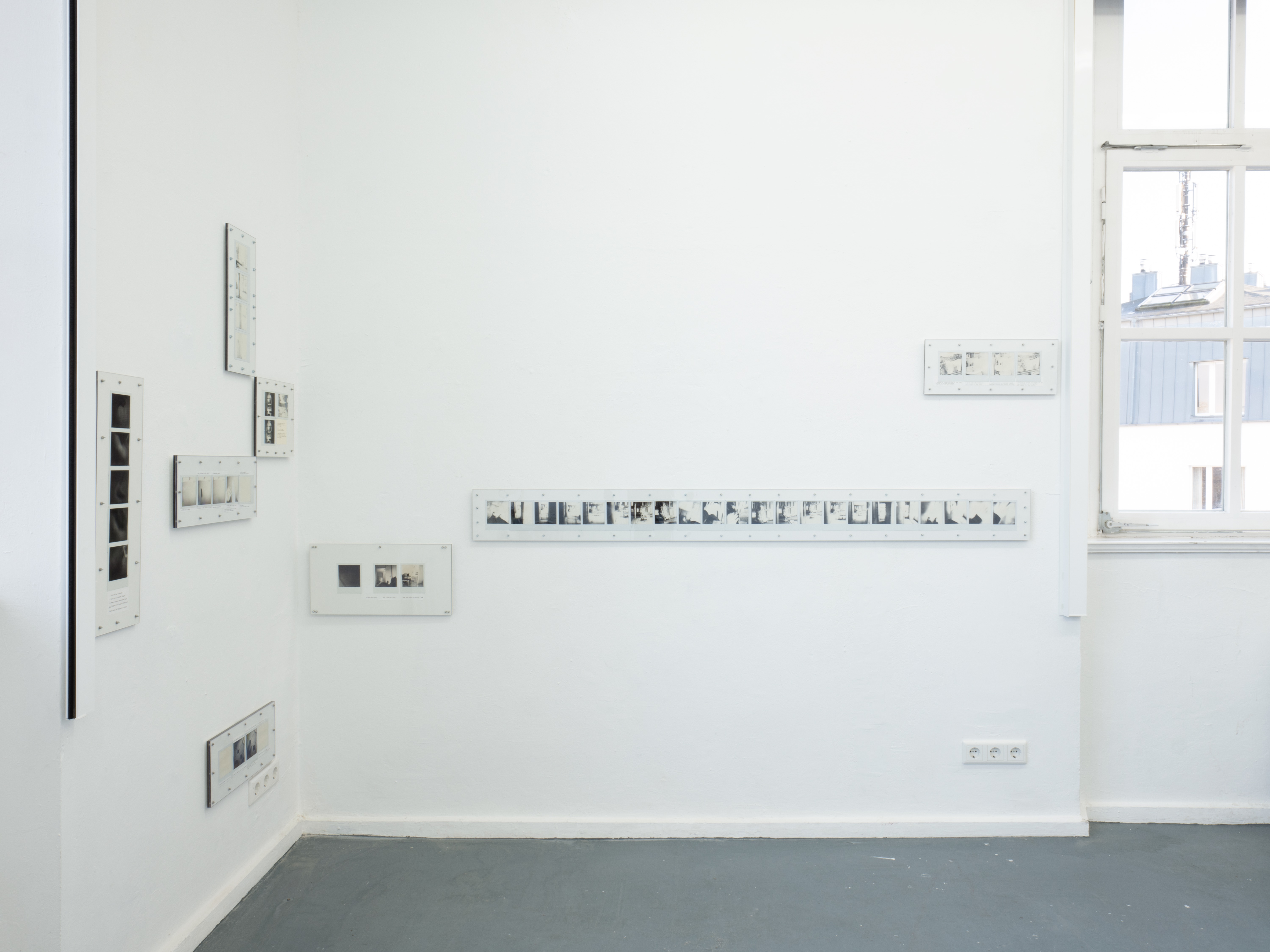 Ausführen bedeutet hier, die Kette oberflächlicher Veränderungen zu beobachten, die sich entfalten, während ich mich durch den Raum bewege: Objekte, die in mein Blickfeld eintreten und es wieder verlassen, die sich nähern oder entfernen, die sich ausdehnen oder zusammenziehen. Indem ich die Beziehung zwischen meinem Blick und meinem Körper verfolge, während ich diesen Objekten begegne, fotografiere ich; ich schreibe. Die so entstandenen Sofortfotos und Texte werden gemeinsam auf einer Platte fixiert und schließen jede Ausführung zu einem in sich vollständigen Abschnitt.