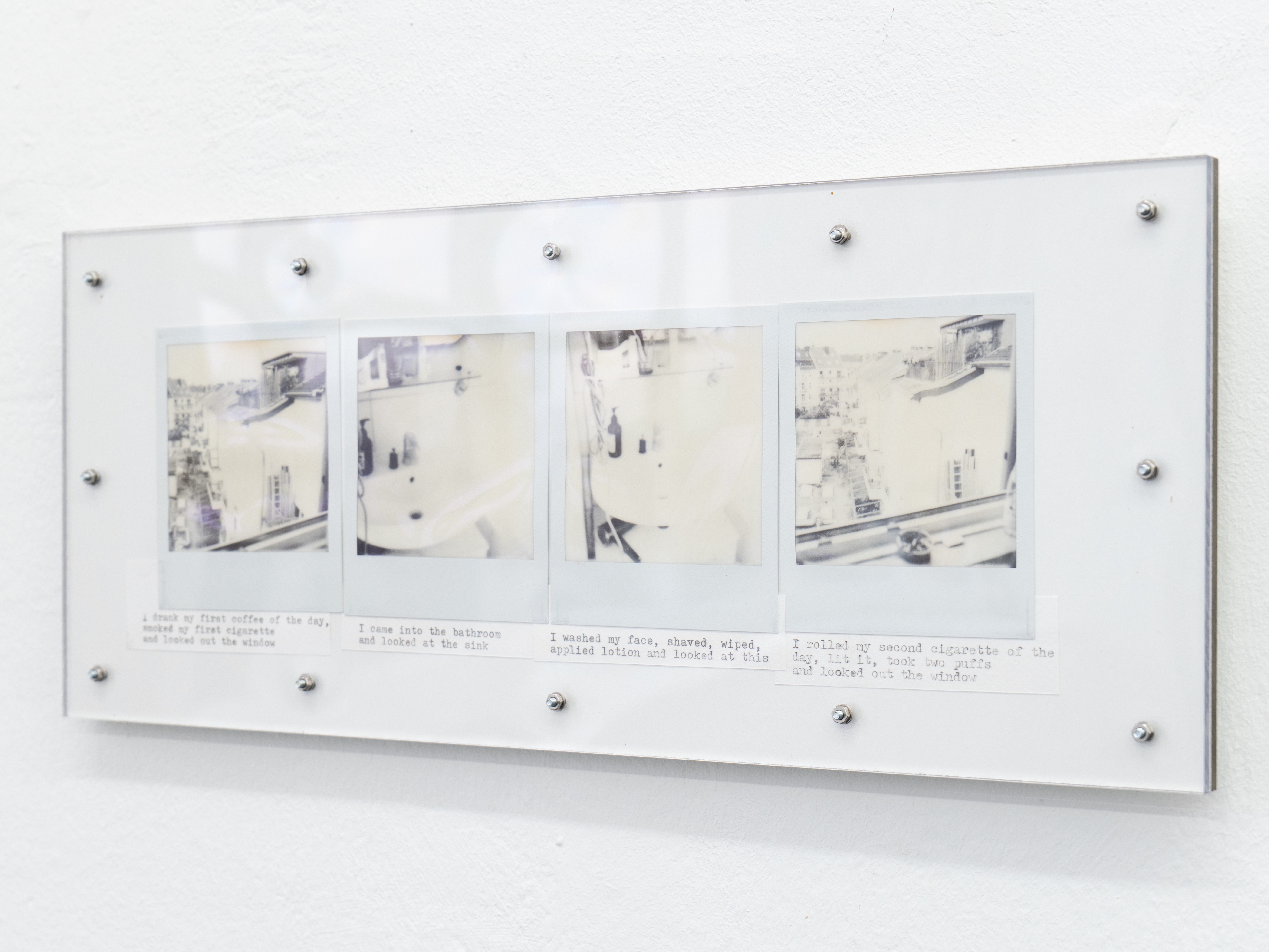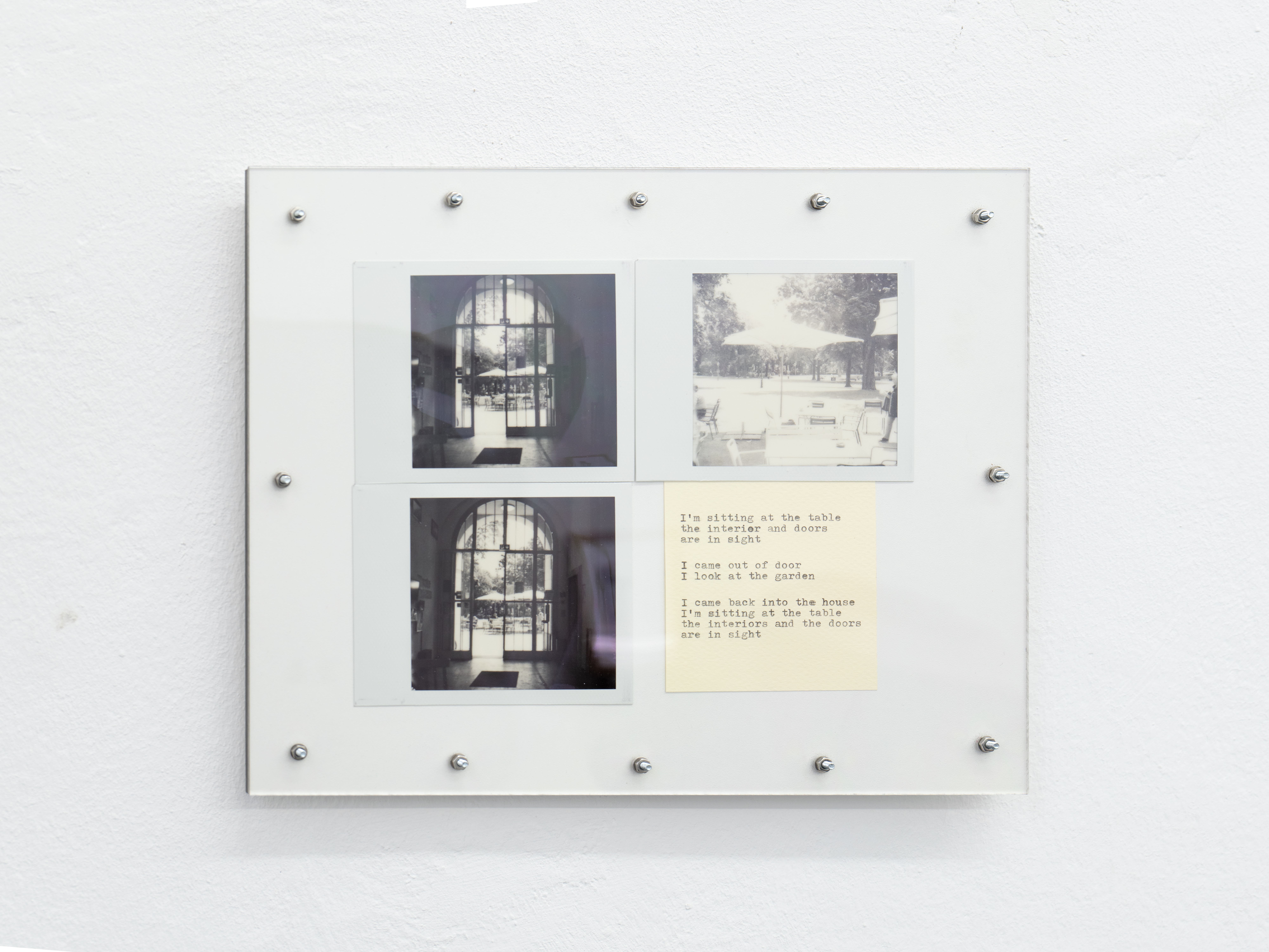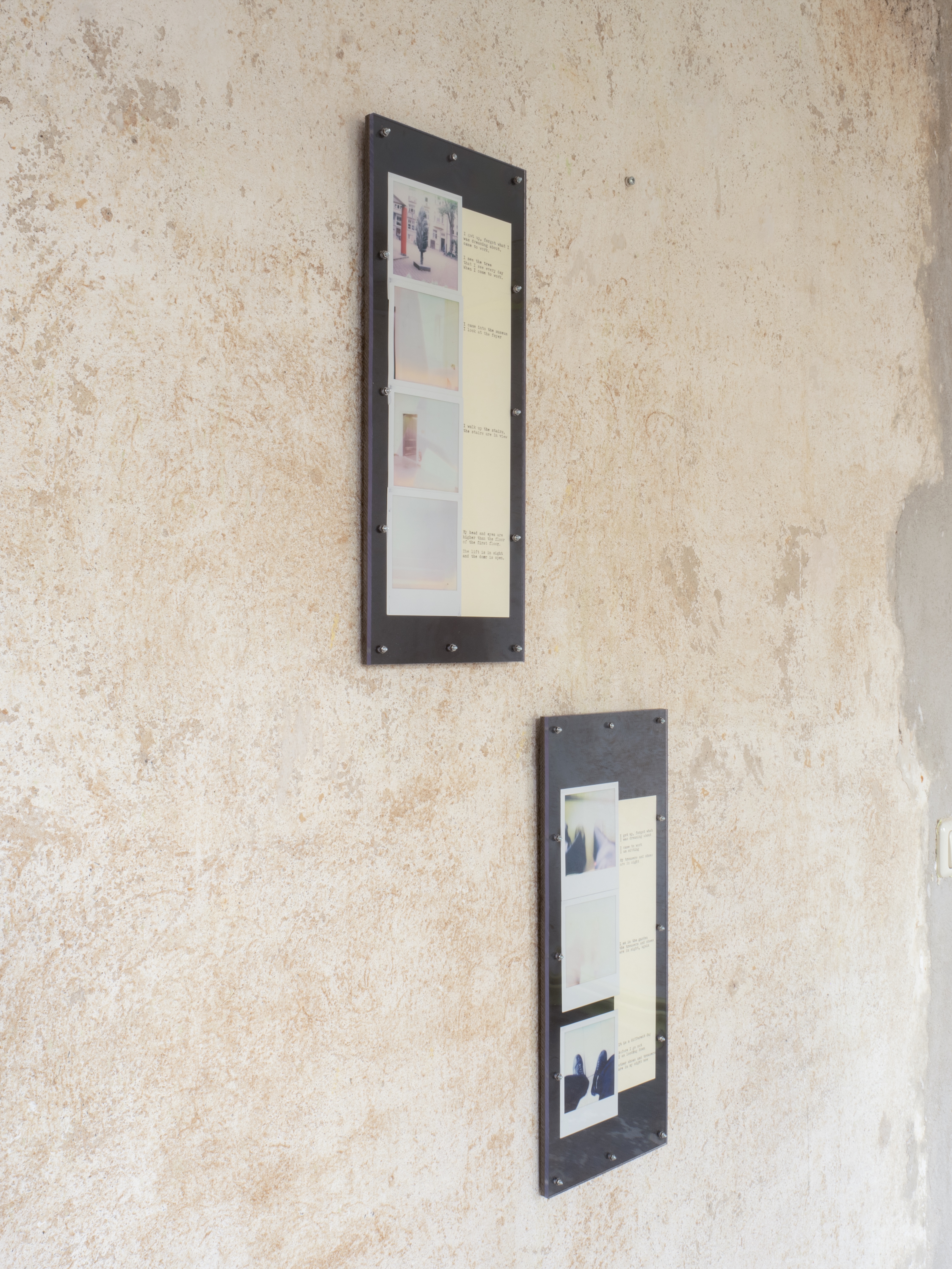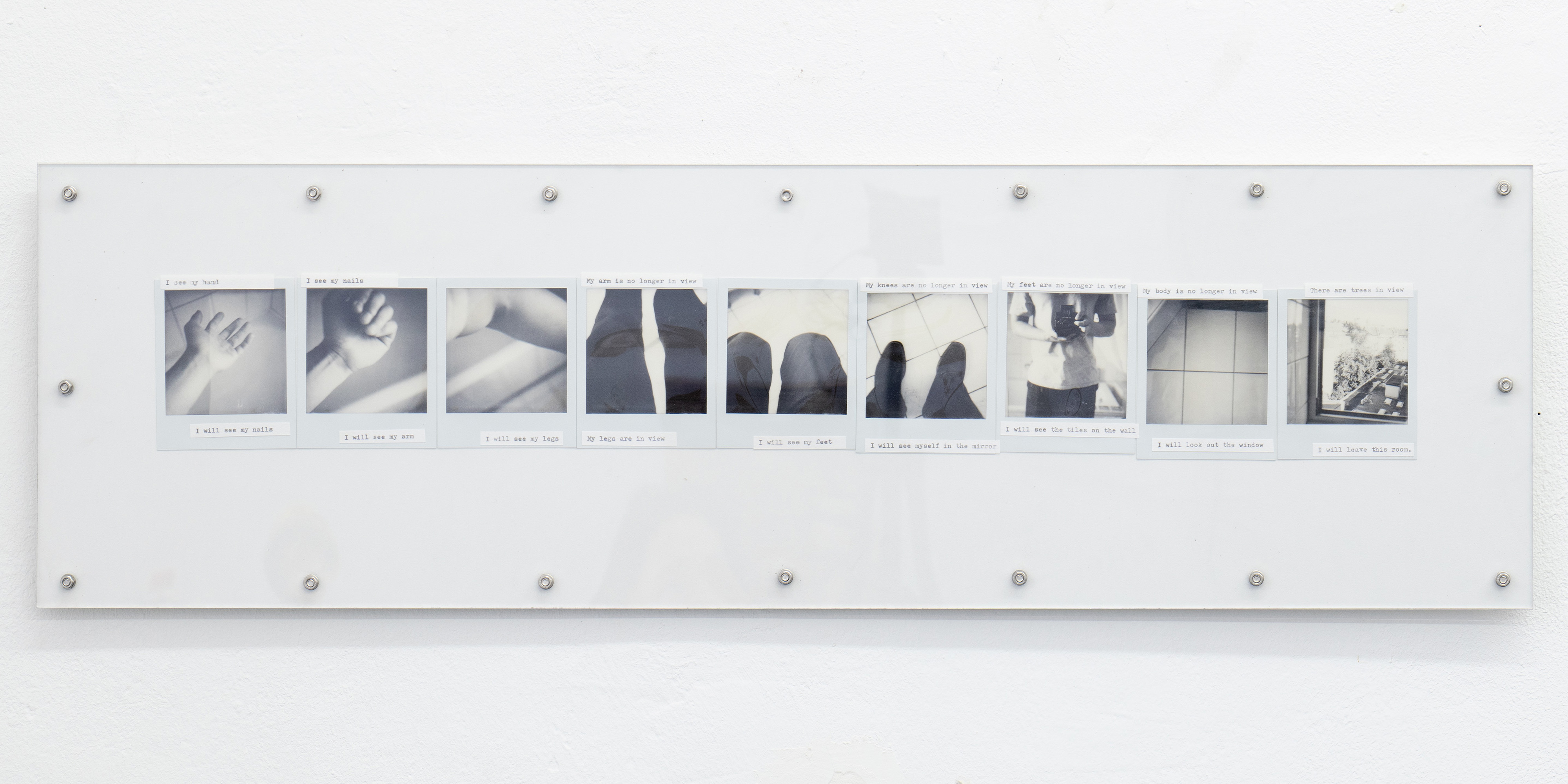 A performance here means observing the chain of changes that unfolds as I move through space: objects entering and leaving my field of vision, drawing near or receding, expanding or contracting. Tracking the relationship between my gaze and my body as I face these objects, I press the shutter and write. The instant photographs and texts that emerge are fixed together on a single plate, completing each performance as its own passage.