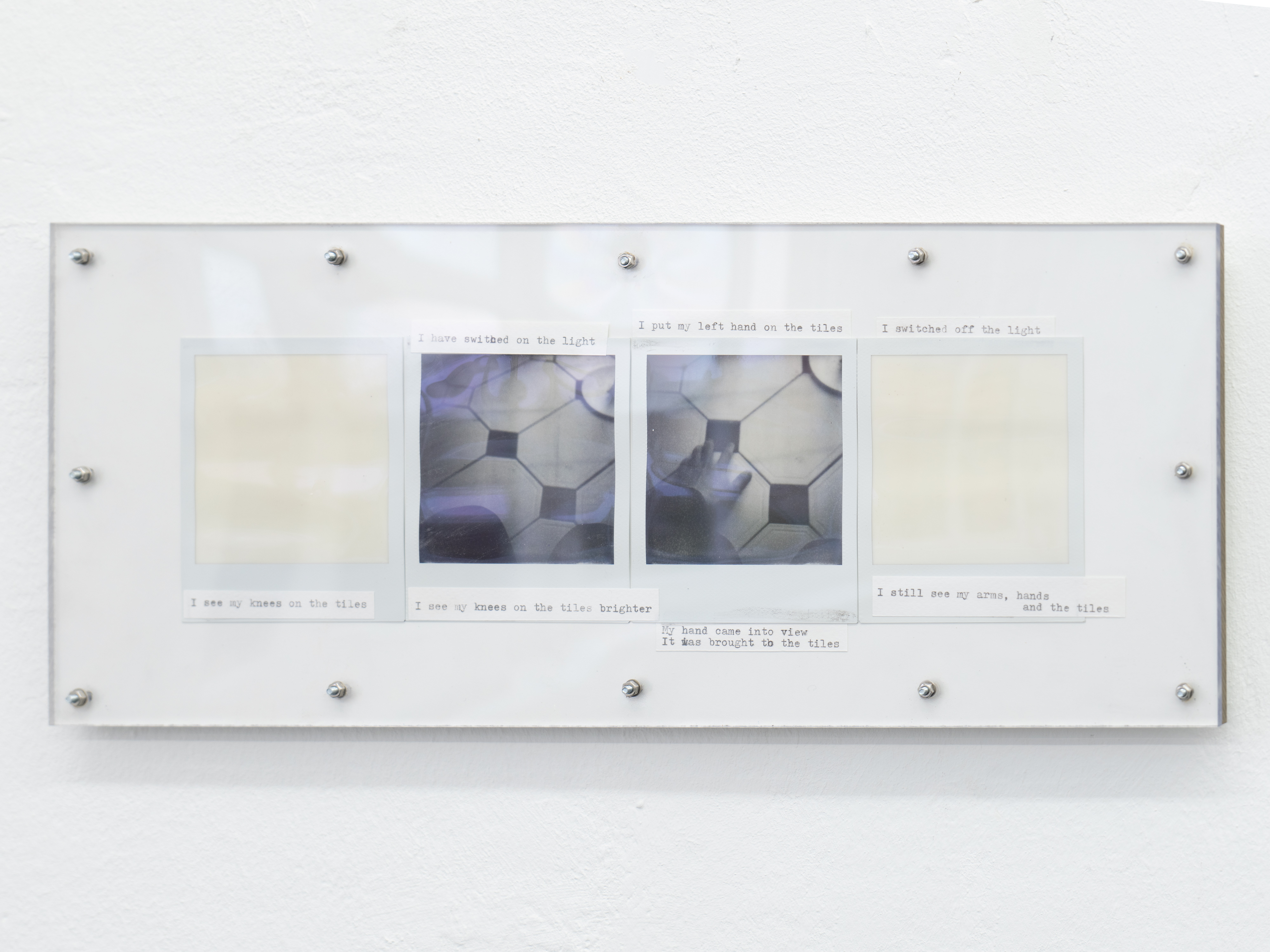 여기서 수행이란 내가 공간 속을 움직이며 펼쳐지는 표면적 변화의 연쇄를 관찰하는 일이다. 사물이 시야에 들어오고 나가고, 가까워지거나 멀어지고, 커지거나 작아지는. 이 사물들을 마주하며 시선과 신체의 관계를 좇는 가운데, 나는 사진을 찍고 글을 쓴다. 이렇게 나타난 즉석 사진과 텍스트는 하나의 플레이트에 함께 고정되어, 각각의 수행을 그 자체로 완결된 하나의 절로 닫는다.