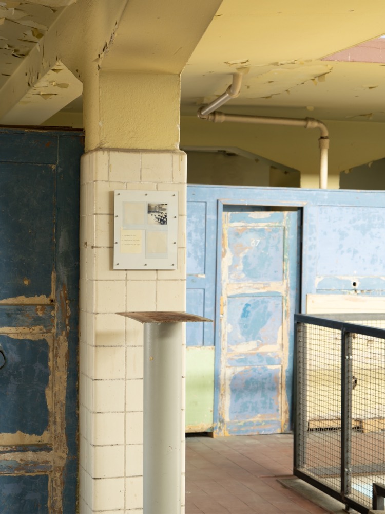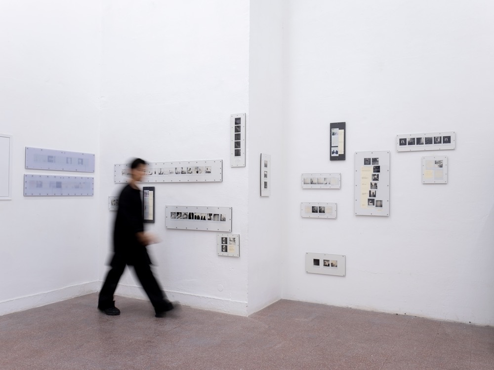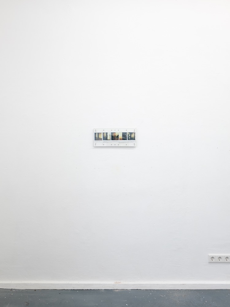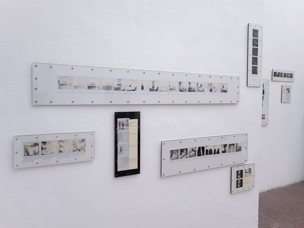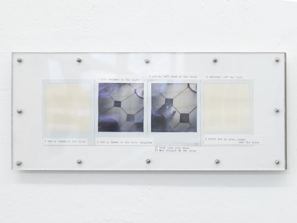 A performance here means observing the chain of changes that unfolds as I move through space: objects entering and leaving my field of vision, drawing near or receding, expanding or contracting. Tracking the relationship between my gaze and my body as I face these objects, I press the shutter and write. The instant photographs and texts that emerge are fixed together on a single plate, completing each performance as its own passage.