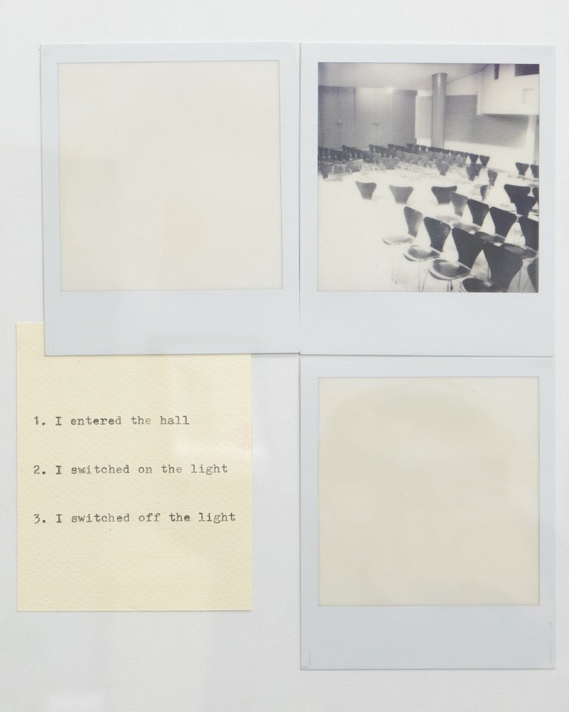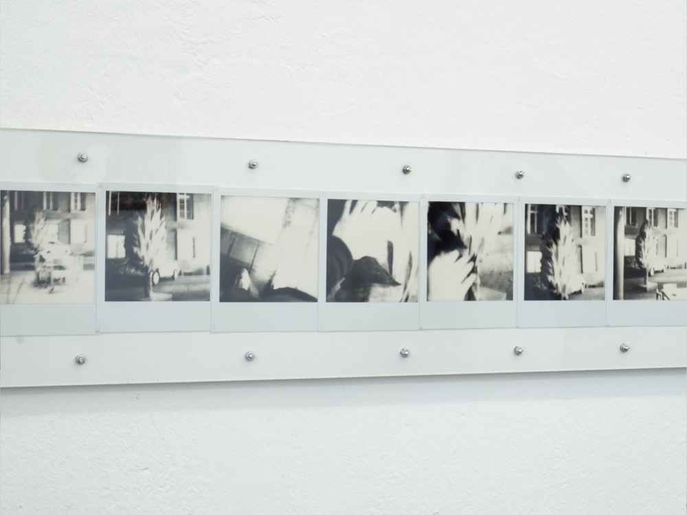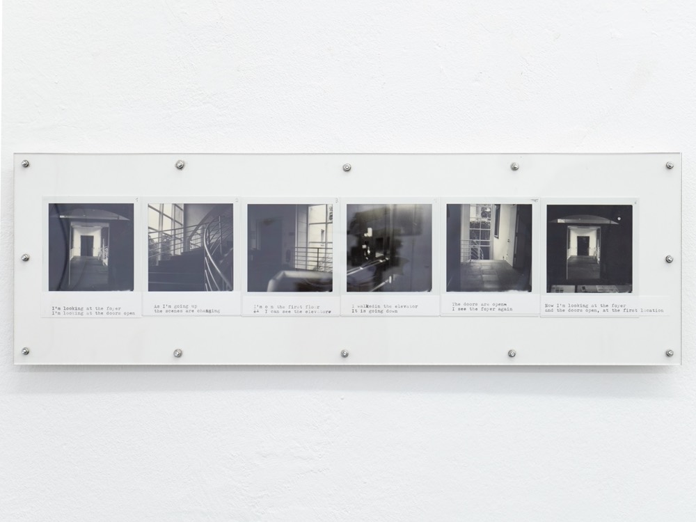 Ausführen bedeutet hier, die Kette oberflächlicher Veränderungen zu beobachten, die sich entfalten, während ich mich durch den Raum bewege: Objekte, die in mein Blickfeld eintreten und es wieder verlassen, die sich nähern oder entfernen, die sich ausdehnen oder zusammenziehen. Indem ich die Beziehung zwischen meinem Blick und meinem Körper verfolge, während ich diesen Objekten begegne, fotografiere ich; ich schreibe. Die so entstandenen Sofortfotos und Texte werden gemeinsam auf einer Platte fixiert und schließen jede Ausführung zu einem in sich vollständigen Abschnitt.